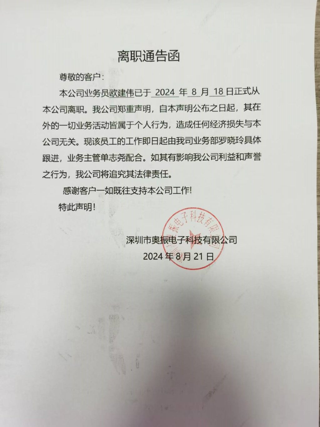 本公司業(yè)務(wù)員歐建偉已于2024年8月18日正式從本公司離職。我公司鄭重聲明,自本聲明公布之日起,其在外的一切業(yè)務(wù)活動(dòng)皆屬于個(gè)人行為,造成任何經(jīng)濟(jì)損失與本公司無關(guān)?,F(xiàn)該員工的工作即日起由我司業(yè)務(wù)部羅曉玲具體跟進(jìn),業(yè)務(wù)主管單志堯配合。如其有影響我公司利益和聲譽(yù)之行為,我公司將追究其法律責(zé)任。